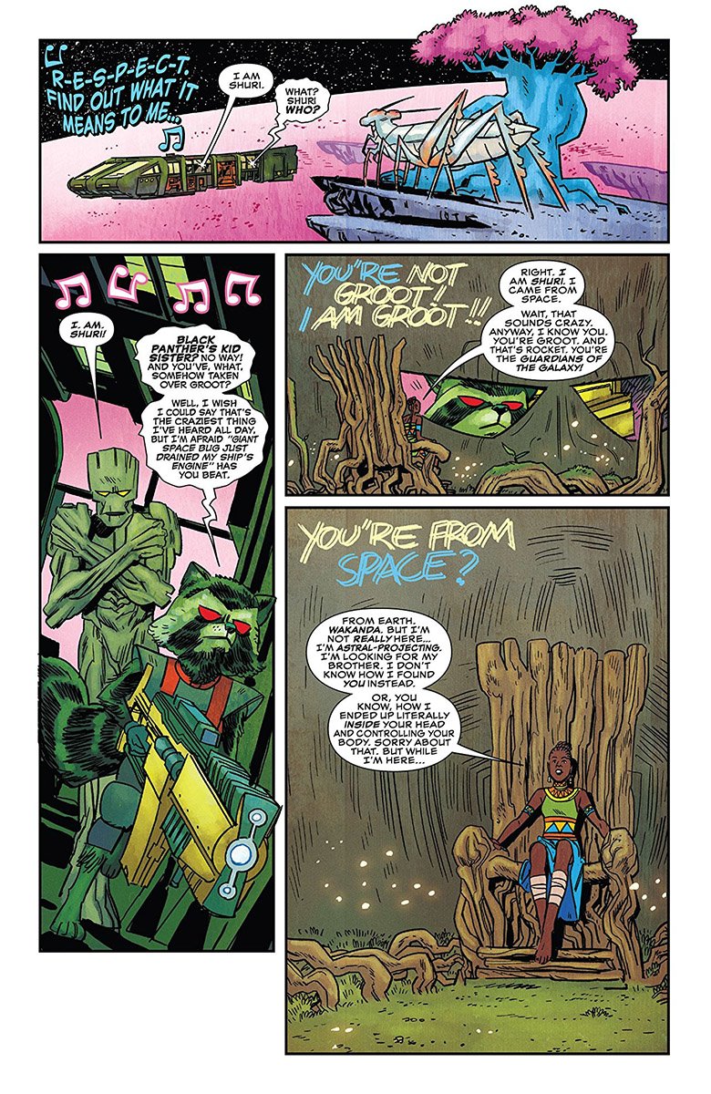 Shuri #3 picks up right where Shuri #2 left off, inside Groot’s head.