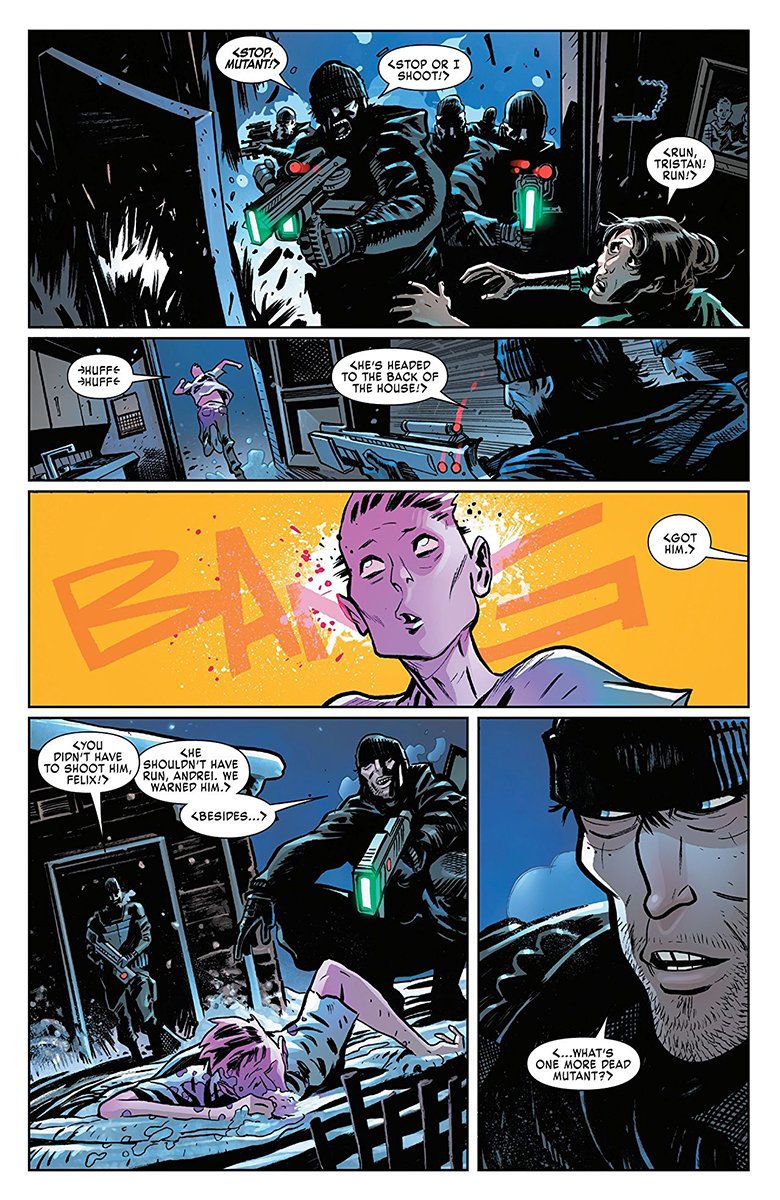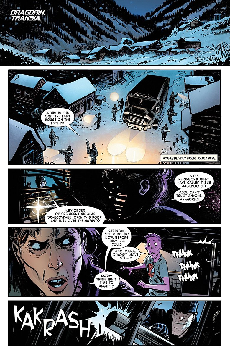 The story opens in a remote village in Transia where a young mutant is hiding with his family. Someone has reported him, and the terrified kid makes a run for it only to be shot and killed by those who feel the best mutants are dead mutants. My inner Magneto was pointing at these jerks stating coldly “This attack cannot be ignored.”