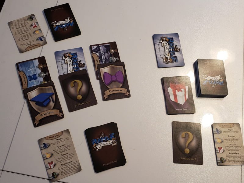 We found setup takes about the first round to get a feel for, but once you play that first round you have a solid feel for the game. First, you shuffle the four card types and place them face down (Battleground, Attribute, Present, and Penguin). Each player receives a Reference Card that does not need shuffling. With the cards shuffled, place 2 Battleground Cards face up on the table and a center one face down. Then each face up Battleground Card gets an Attribute Card placed face up beside it. A face down Attribute Card then goes beside the face down Battleground Card. Next, each player receives 7 Penguin Cards.
