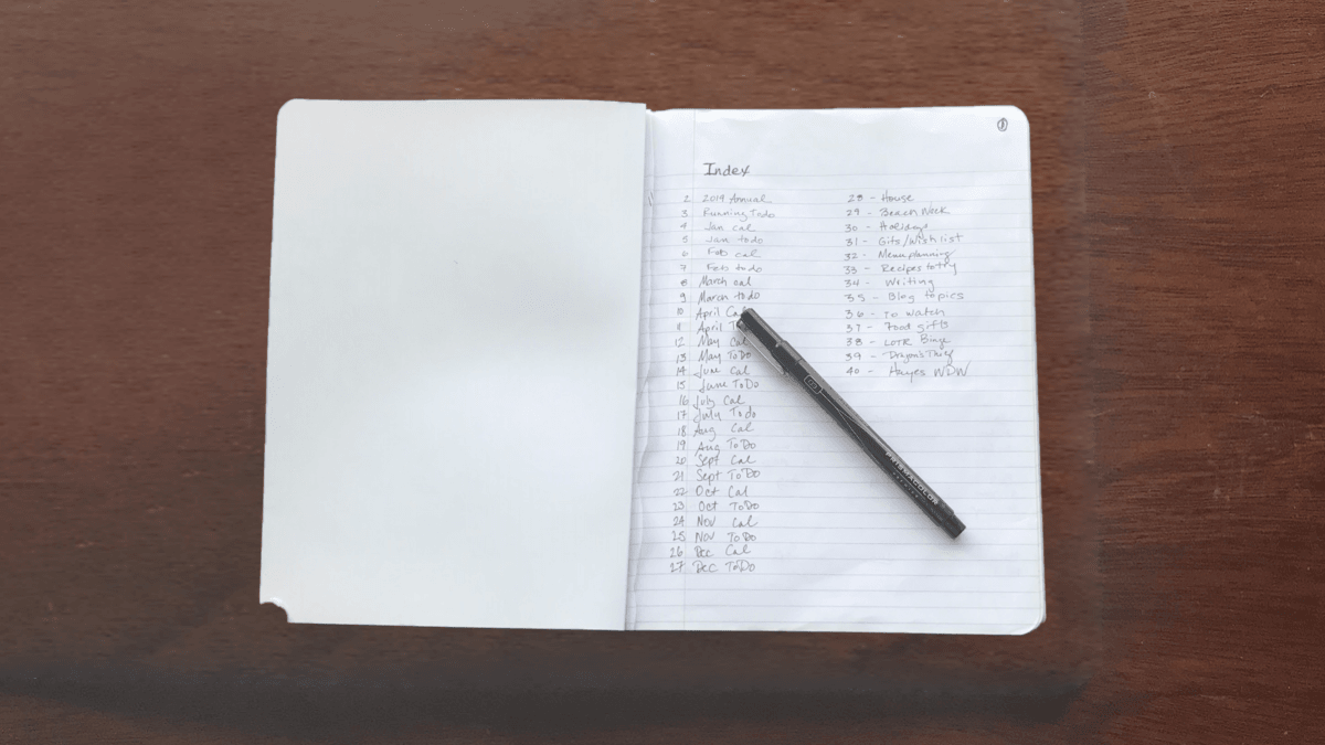 All of this is data and items that I’ve been keeping track of before, but now it’s in a single notebook, and—this is what really got me into the whole idea—there is an index at the front that tells me what page everything is written on. This is genius and I’m kind of embarrassed I never even thought to do this before. Now, my collection of Important Stuff has its own page of pointers and I can skip quickly to what it is that I need. I feel so accomplished.