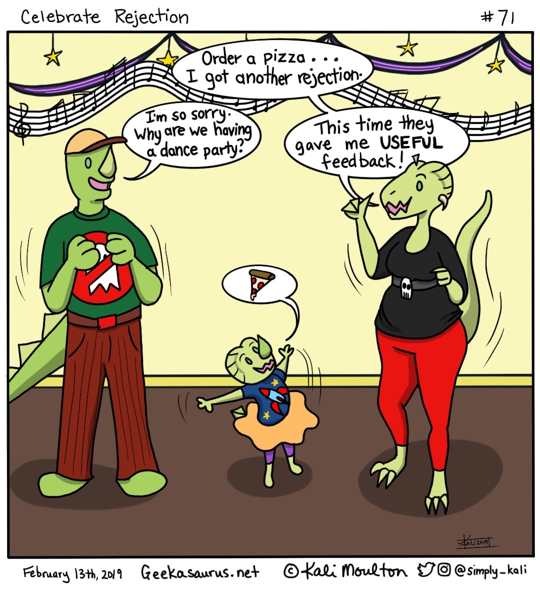 I celebrate rejection. I celebrate each and every “sorry, it’s not for us.” It doesn’t matter what creative project I’m submitting – writing, illustration, comics, paintings … and I say this as someone who has been rejected a lot. My work, creations that I have poured my heart and soul into, is constantly rejected over and over and over again. I still make it. I still love what I do. I still try to expand my mind, my viewpoint, and my voice.
