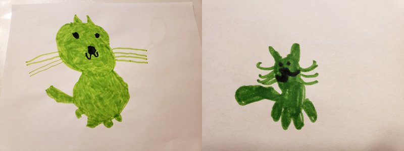 The boys then went to Ed Emberley’s Big Green Drawing Book and tried to recreate a cat. There was certainly some improvement from W.