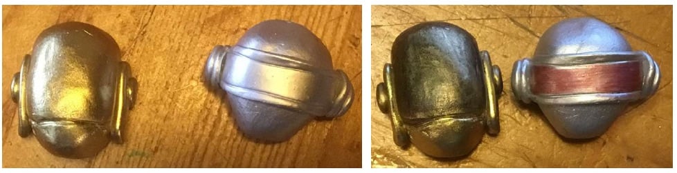 For the first helmet, make two flat earpieces for the sides. Paint this one gold after baking, and add a large black area to the center.