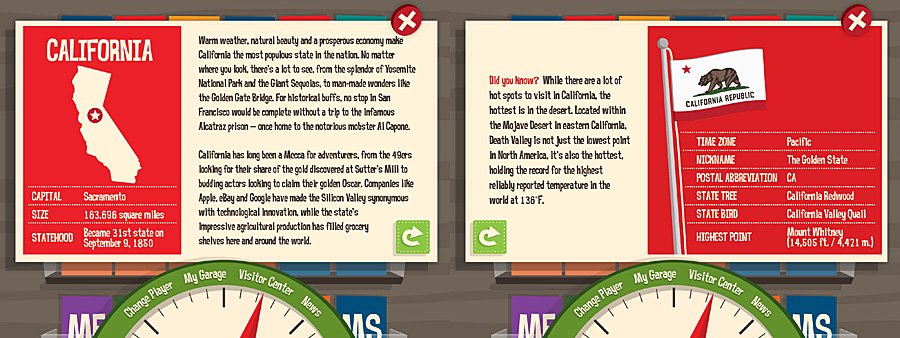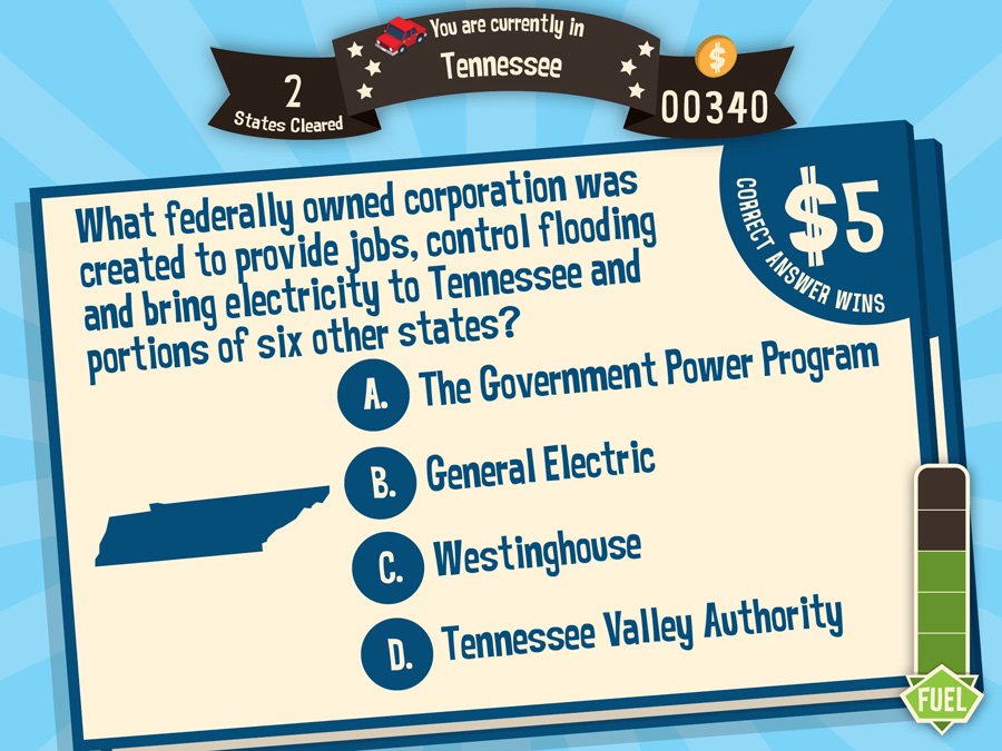 As you travel from state to state, your fuel gauge will gradually decrease and you will soon need to visit a fuel station. Visiting will cost you $5 each time and gives you five questions where you will need to identify locations on a map such as oceans, lakes, famous trails, and mountains. As with the state questions, you are given multiple choice options, in this case, points to pick from on the map. Each question you answer correctly fills one notch on the fuel gauge.