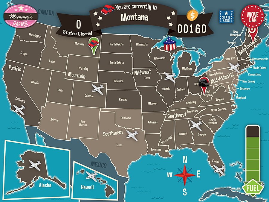 Players begin a game of Geography Drive USA by setting up a profile area called a garage (the app can hold up to three at any one time) and receiving a basic car and full fuel gauge before being dropped onto the US map.