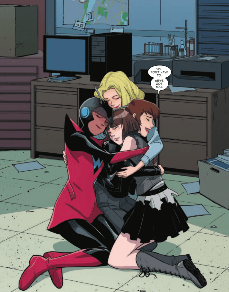 The second thing I love about this story is that Nadia is not “fixed” by this. She and Priya emerge from the lab just as Bobbi and Janet arrive. Janet asks Nadia if she’s okay, and Nadia stumbles, but says that she’s not. That she can’t manage this alone. And as the four sink into a cuddle embrace of epic proportions, Janet says that she doesn’t have to.