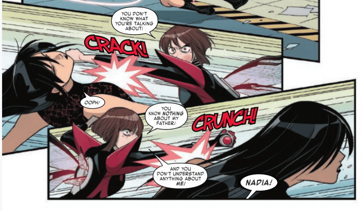 In the aftermath of issue #4, everyone is furious with Nadia. A flat-out brawl breaks out, with Nadia using the full powers of her Wasp suit to fight the rest of her team. And not just Ying, who can arguably hold her own, but the unpowered members as well (and, to be clear, beating on someone who can “take it” isn’t better or safer). Nadia says things like “I didn’t mean to hurt anybody” and “I’m not the bad guy here.” As she disappears back into her lab, she says, in words that fade and shrink, “I’m sorry.”