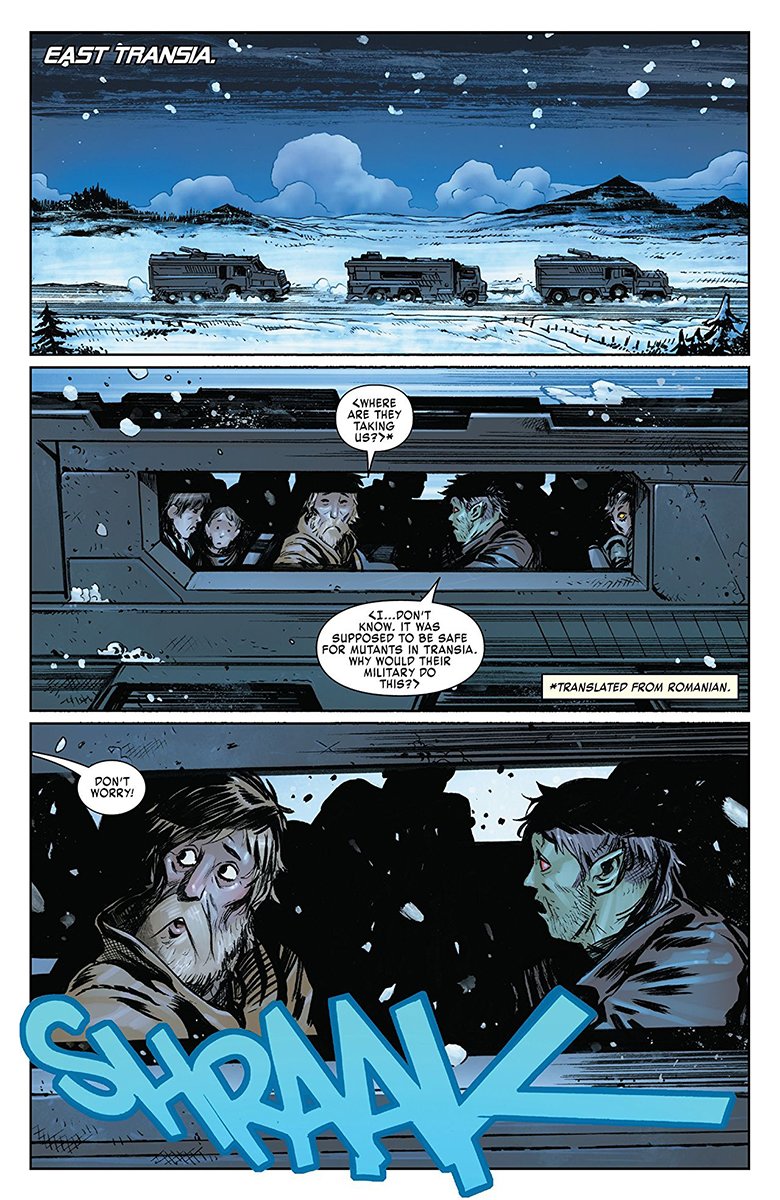 Constantin discovers that wiping the “mutant disease” as he puts it from his country is not as easy as he thought. We learn that his fight isn’t just a xenophobic fear but a personal hatred for what he feels mutants have done to his son. He looks to the help of a madman stranded out of time. Those who read EXtermination will recognize this insane castaway.