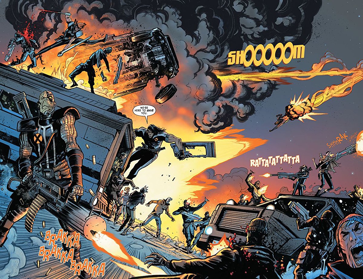 There is less dark humor in X-Force #2 than there was in the last issue, but that is because there’s nothing funny about genocide. Brisson’s writes solid emotion into every major character in this issue. Warpath’s fury at the traitorous mutant soldier, Shatterstar’s anguish over the loss of Cable, Kid Cable’s dark determination, Constantin’s blind hatred—each of them communicated distinctly and unflinchingly. Brisson writes these emotions the way our characters would feel them—raw and honest.