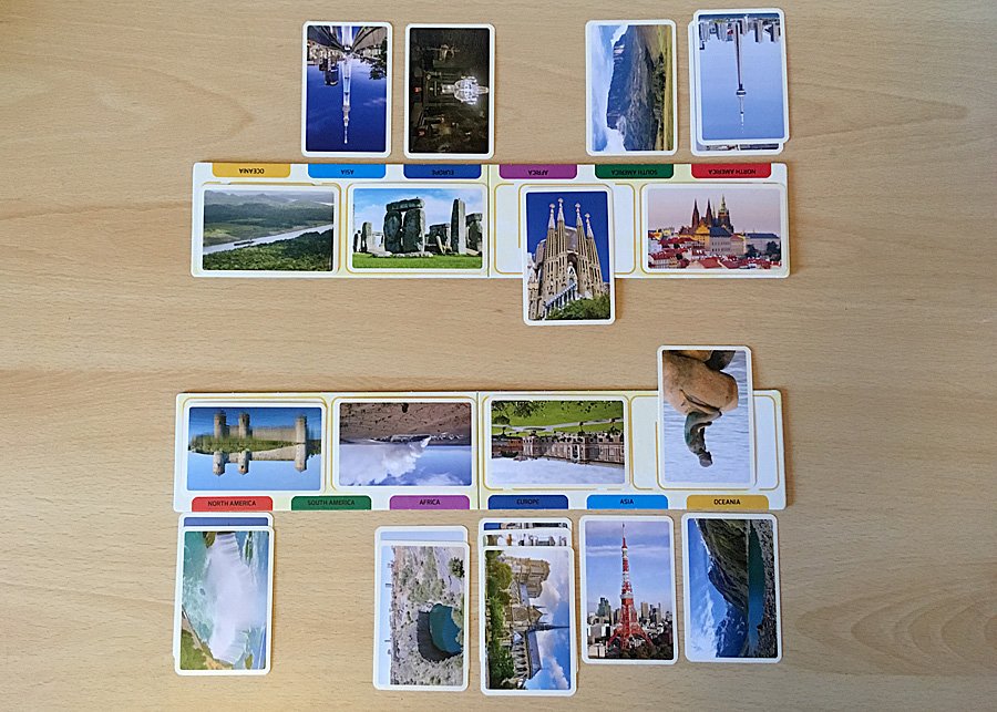 Each player then takes a Continent Board and places it in front of themselves with the writing facing toward them and enough space to place cards in portrait orientation below it. They then take four cards from the Question Deck and place those cards picture side up on the four spaces on their Continent Board with the image facing toward the other player/s. The game is now ready to play.