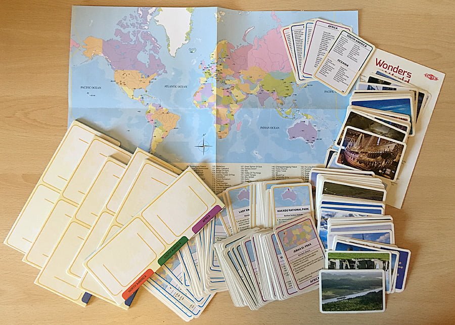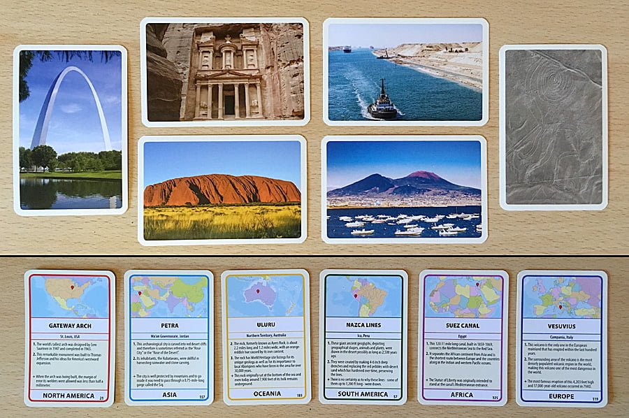 Wonders of the World and Flags of the World are two complimentary games for two to six players aged eight and up that teach geography skills. In the games, you are challenged to match flags or famous landmarks to their correct countries and continents.
