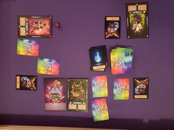 The setup of Fuzzy Mage Fight is extremely quick. Set aside the Fuse Cards in their own pile, and shuffle the Mineon, Trap, Magic, Spell, and Potion Cards into a a Game Card deck. Roll the die to determine which player selects their Fuzzy Mage card first. It can be a choice or random, but we found random to be fun. Whoever goes first also ends up with the Garbel Card. Play will then go clockwise from Player One. Each player gets three Game Cards and the remaining deck is set aside.