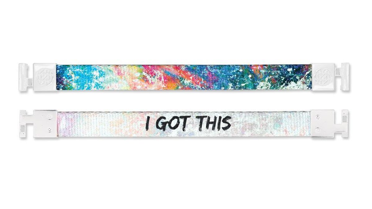 Straps are stretchy elastic that fits over wrists up to 7.5 inches. Each one comes with a matching plastic art card and a reusable bag to protect your band when you’re not wearing it.