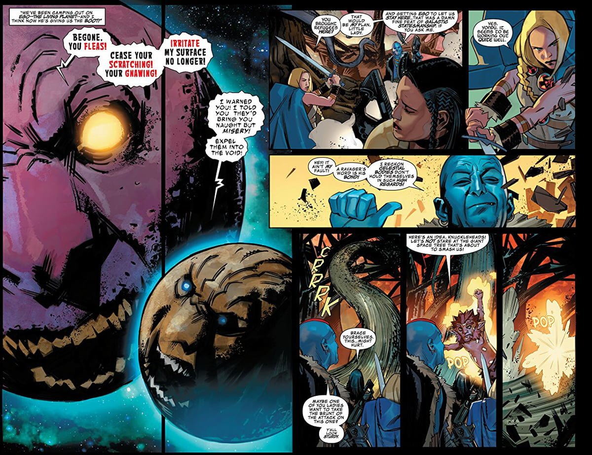 In Asgardians of the Galaxy #6, we met Sera, Angela’s love, and her team The Ravagers. Sera introduced Angela to the Refugees the Ravagers were protecting from Chargazel’s Raiders. Before Sera finished explaining who they are and how she found them, Chargazel’s Raiders attacked the camp, and that appears to have woken up Ego, the Living Planet. If you’ve ever had someone wake you up due to their fighting, then you know just what how Ego feels. A tired and cranky planet awakened because some nimrod is dropping bombs all over their surface isn’t going to be a good situation for anyone.
