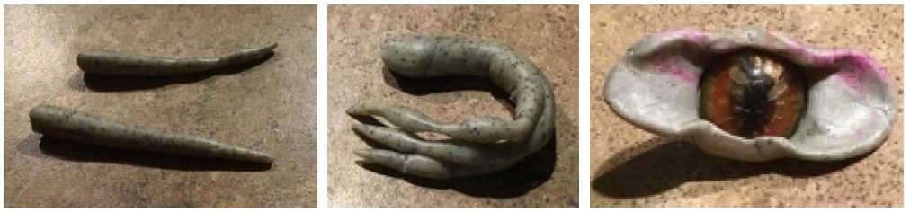 Roll three little tubes of clay with tapered ends for claws (just like little versions of the tentacles).” Have them coming out the edge of the hole as if they are breaking out. Use a toothpick to add texture or scales if desired.