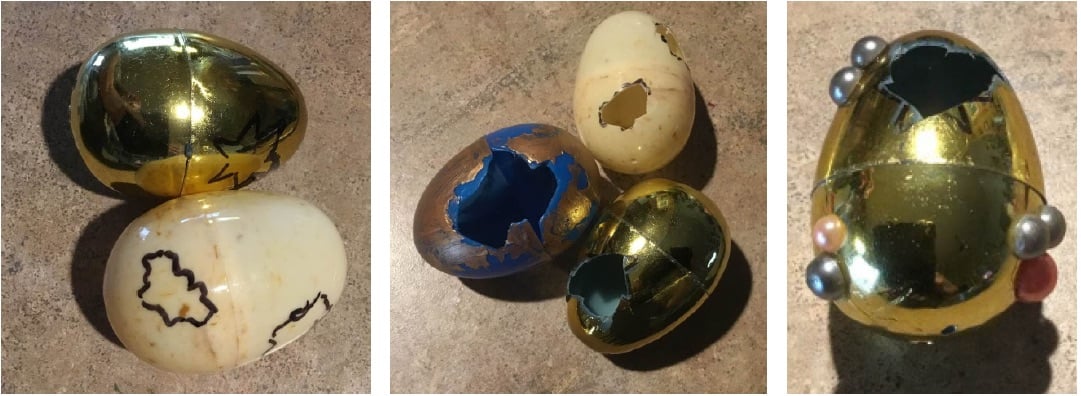 Add some texture or darker color to the eggs using self-adhesive pearl stickers (often found with scrapbooking supplies). Paint or spray it silver, black, brown, grey, or any color that doesn’t look like a bright, plastic egg.