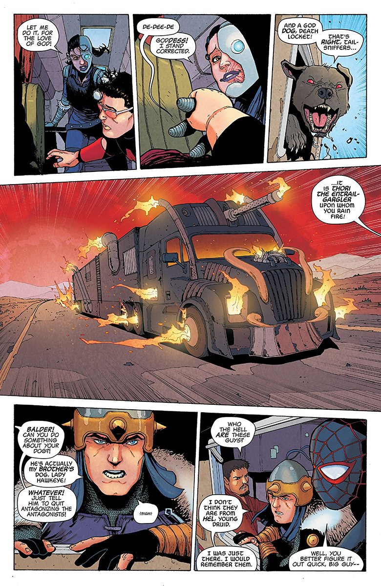 From Freya confirming that she and Odin had sex, to Thor comforting a shocked Balder, to Wonder Man’s remarks about being a pacifist, to Miles explanation of the Spider-Verse and his admonition to the Silent (not-so-silent) Norn “You know I’m not made of spiders, right? That’s another guy,” each moment of levity serves to contrast the dire circumstances Earth is facing.