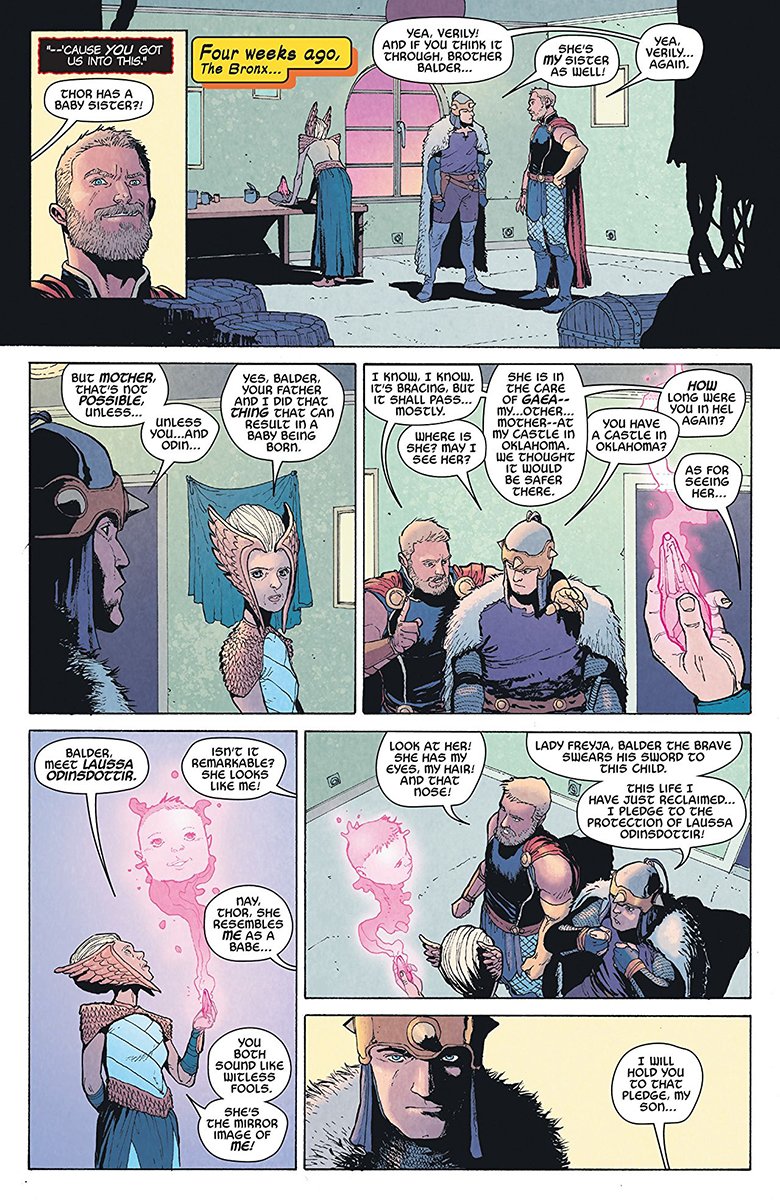 This summary clues us in right away that this is going to be a different type of series. The playful parenthesis emphasizes that it doesn’t take itself seriously. Thor and Balder just discovered four weeks ago that Odin and Freyja had sex. Imagine that parental sex revelation! The product of that union is a conveniently timed baby sister.