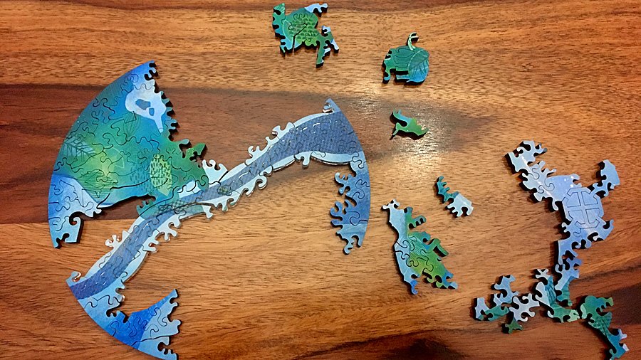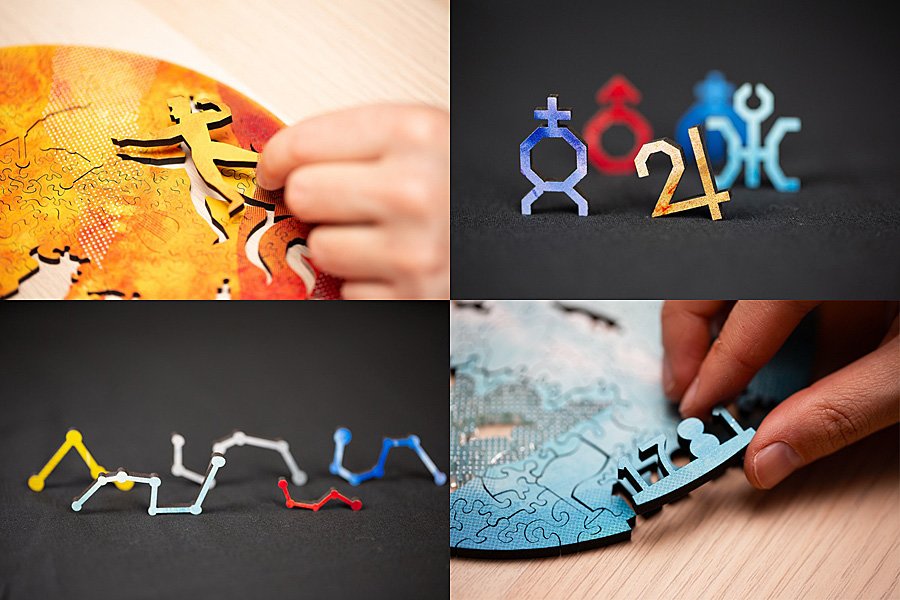 The level of detail in these puzzles is unlike anything I have come across before. While I have seen and built laser cut wooden puzzles before, including puzzles with unique shaped pieces (British company Wentworth have been producing these in their Whimsies range since the 90s) the way the Pieces of the Galaxy range combines this with so many other features – including combining pieces from the entire puzzle series into a separate, moving puzzle, is totally new.
