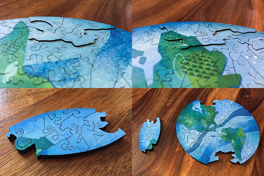 At the most basic level, Pieces of the Galaxy puzzles are jigsaws. Unlike with the majority of jigsaws however, these puzzles are laser cut from wood and acrylic making every piece unique. This also makes them surprisingly difficult for their size and piece-count. HelloFish sent me a first run copy of the Earth puzzle, and it was by far one of the trickiest puzzles I have ever worked on. However, there is much more to the Pieces of the Galaxy series than just regular jigsaw puzzles.