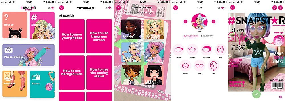 The Snapstar App contains five sections. The most prominent is the Photo Studio where you can take pictures of your dolls. When you open it, it will prompt you to select the doll you are currently photographing, however, by selecting a different doll you can choose from a different range of hair and makeup options. I’d have loved to have seen all these merged together into one larger range of options rather than separated into six different areas.