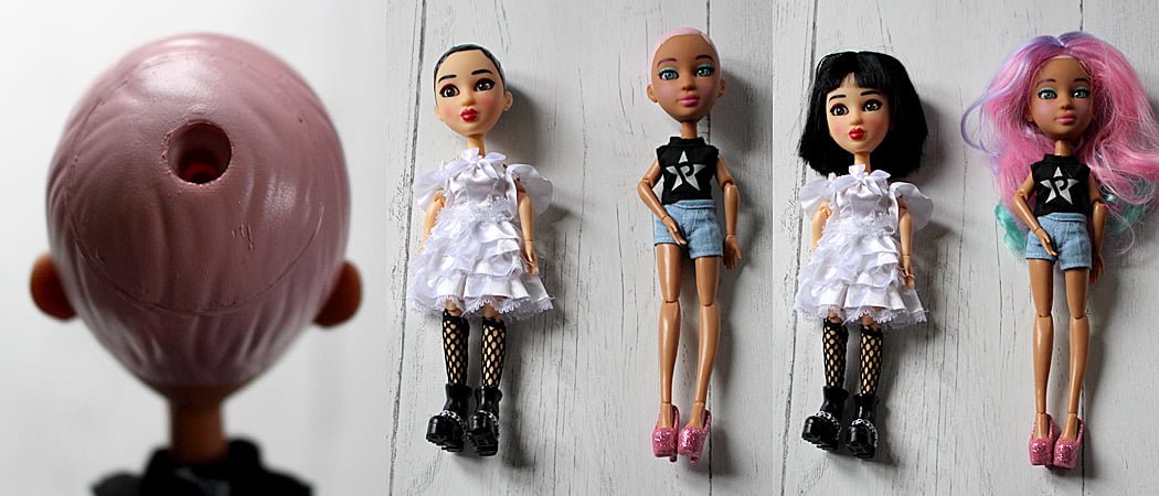 For the most part, the Snapstar dolls themselves are fairly standard fashion dolls. They stand somewhat shorter than an average Barbie but they are a lot more poseable. All the dolls are jointed at the ankles, knees, hips, waist, wrists, elbows, shoulders, and neck so they can be positioned in lots of ways for photos. One of the most unique aspects of the Snapstar Dolls themselves is their removable hair—each doll has a hole in the back of her head and the hair pieces come with a plastic plug that fits into the hole to secure it onto the head. This feature is mostly to help with the process of taking green screen photos, but it adds an interesting element to the outfit changes as switching over the dolls’ hair completely changes a look.