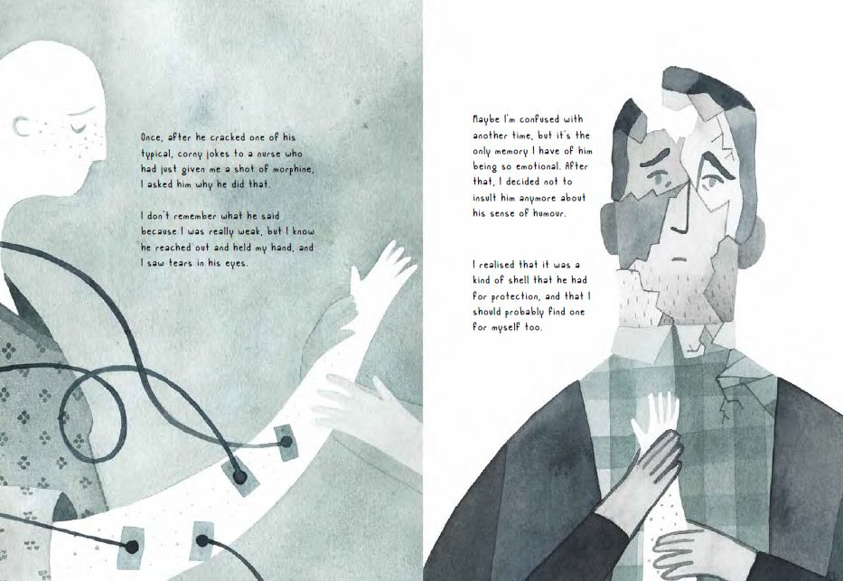 I’ll admit that the artwork in this book wasn’t really my style, however, I felt it worked well for the story and there were moments where it really spoke to me. As the girl and her parents wait to hear her prognosis on a sterile, plastic, hospital bench, they seem to shrink away into their own personal darkness on the page in front of you. It is profound, and moving, and all too familiar for anyone who has waited on similar phone calls.