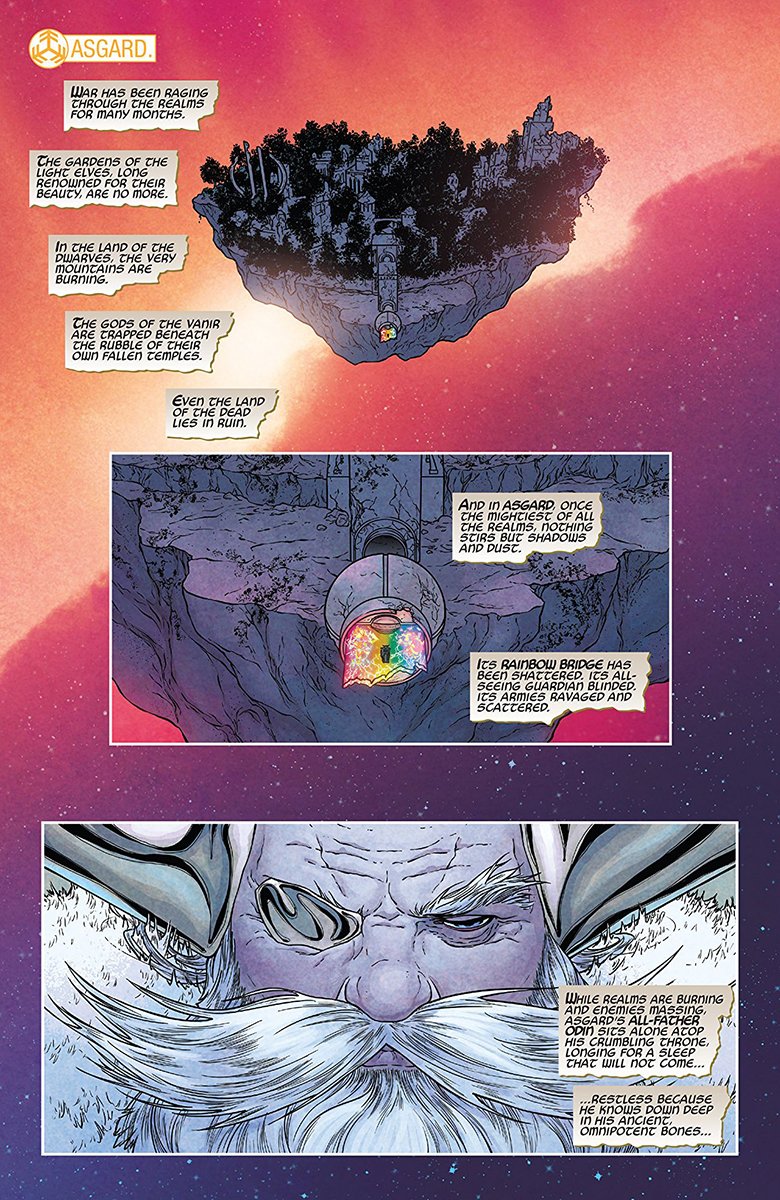 The War of The Realms #1 opens with darkness, and the unexpected death of Odin. After Mangog’s destruction of Asgard, the gods and goddesses have left. Only one remains. Odin sits brooding, exhausted from his battle with Mangog to the point that he can’t even begin repairing the damage. Knowing that that Odin would be at his weakest, Malekith has dispatched Dark Elf assassins to end the King of the Gods. So, this issue begins with an ominous and gruesome demise that portends Malekith’s intentions and the fate of Midgard.