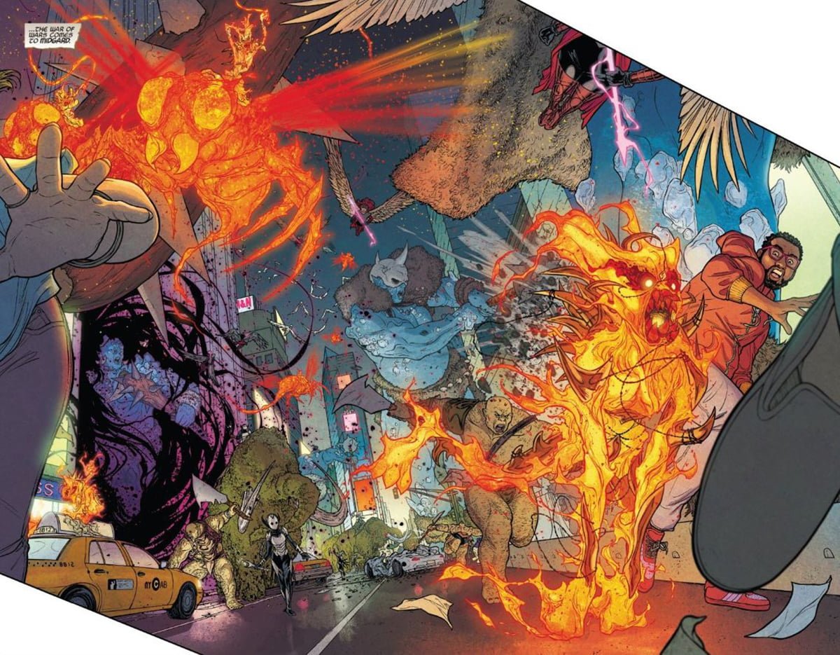 The War of The Realms explodes in a visually stunning two-page splash page where all hell breaks loose right in the middle of downtown New York. Frost Giants lumber through the streets; Dark Elves brutally slaughter anyone they meet, Trolls trash vehicles taunting terrified humans, Heven’s War Angels rip helicopters and planes apart in the air.