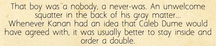 While Hera is recognizably Hera in A New Dawn, just a younger and more naive version of the character we saw in Rebels, Kanan is frequently unrecognizable. The Kanan of these pages is a very long way from his padawan roots as Caleb Dume and he is actively seeking to hide from his past, not only physically to keep him safe from the Empire, but also mentally. During one passage, he notes to himself that whenever he feels himself taking a course of action that Caleb would approve of, he knows he is making a bad choice. However, no matter how he acts or what he tries to make himself believe, Kanan and Caleb share the same heart and Kanan cannot bear to see people hurt when he has the opportunity to intervene.
