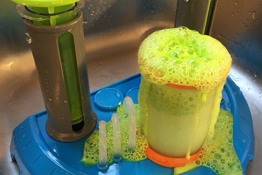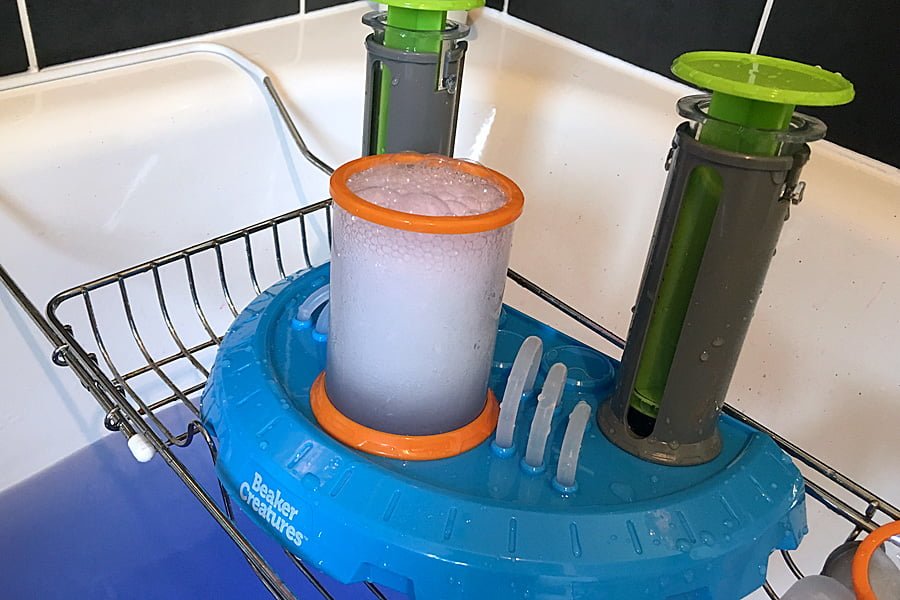 Pushing down on the two Hydroplungers simultaneously (the simultaneous part is important or physics will backfire on you) will send water through the coiled tubes and into the chamber where the Reactor Pod will begin to.. React. At this point, you’re probably going to wish you’d done this on top of a towel. For reference, even with the plastic drip tray from the box underneath the Super Lab, it made a mess. I gradually moved our Beaker Creatures experiments from the kitchen counter to the kitchen sink and then to the bathtub – if only to make cleaning up easier. The Reactor Pods fizz with quite a bit of energy, although we did notice that the amount of fizzing seemed dictated by the color, with certain color pods giving off a more energetic reaction than others. After our first reaction, as seen in the video below, I was spotting purple flecks up my kitchen tiles.