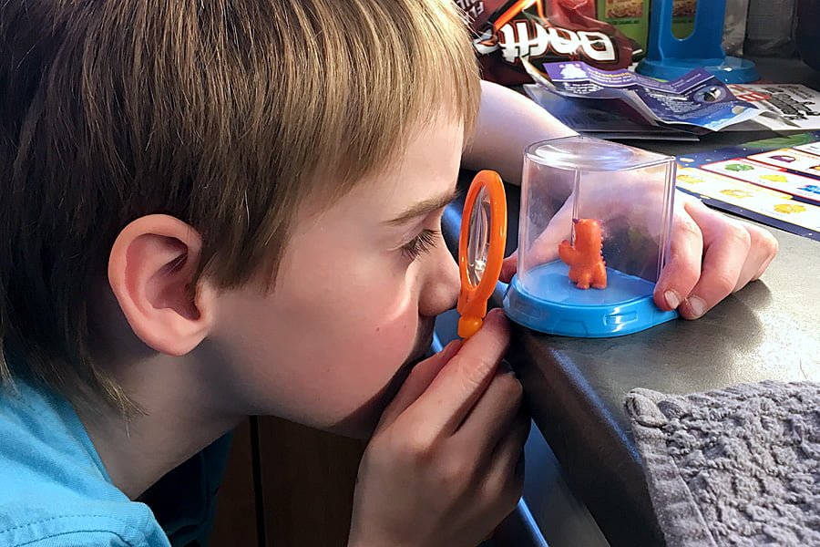 Perhaps strangely, the Bio-Home was one of my favorite items from all our sets, even though it doesn’t do much either. This is a small plastic container which can house one or two Beaker Creatures with a built-in magnifier in the “glass” at the top. At the back is a slot where you can slide in a background. All the classification cards that come with the Reactor Pods are backed with an illustration of an appropriate landscape including underwater, outer space, etc that can be used here. This gives you a cute little scene that you can display which is easy to change with different creatures and backgrounds making it much more aesthetically pleasing than the Magnification Chamber. If your kid wants to display their Beaker Creatures – this is the set I’d choose.