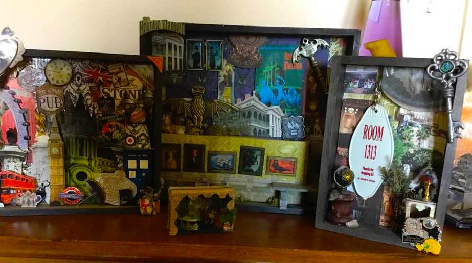 This is where shadowbox memories take things to the next level with little extra effort. Souvenir figurines, pins, magnets, toys, or other small items can stand out beyond the shelf or refrigerator when given a little extra attention in a cool shadowbox display.