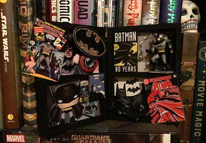 Pick a background. I’m getting ready to celebrate the 80th anniversary of Detective Comics with a Batman-themed shadowbox, so I found old “Gotham” cityscape or old pages from a comic for my background. This works with any theme. A shadowbox showing off a recent trip can incorporate travel brochures or family photos.