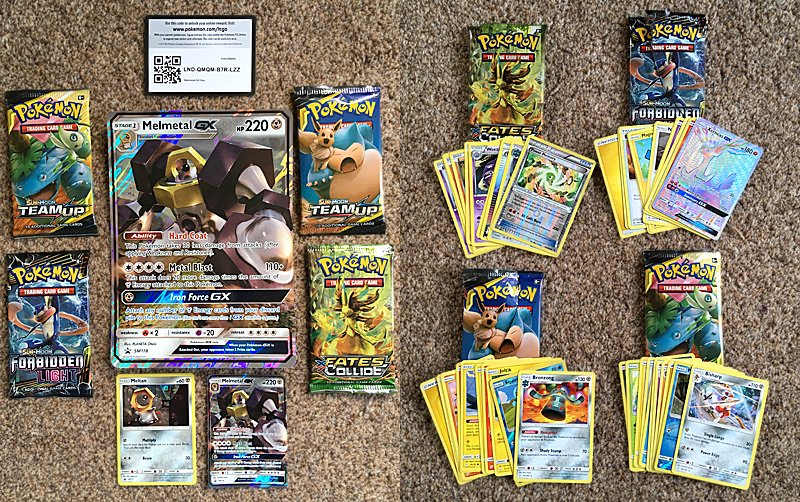 The first of three GX boxes we were sent, this set features Melmetal and (to a lesser degree) Meltan. These mythical Pokémon were recently the center of attention in Pokemon Go with dedicated special research and the ability to acquire additional Meltans by linking your Pokemon Go game to a copy of Let’s Go, Pikachu! or Let’s Go, Eevee! on Nintendo Switch.