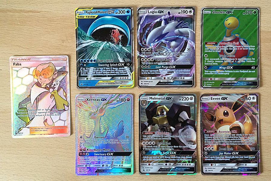This ended up being the most successful box of the four in terms of booster pack pulls. From the four booster packs (made up of two Lost Thunder packs, one Celestial Storm pack, and one Evolutions pack) my son pulled a holographic Mewtwo, a Lugia GX, and an Ultra-Rare Faba Full Art Holo, which he was incredibly excited by.