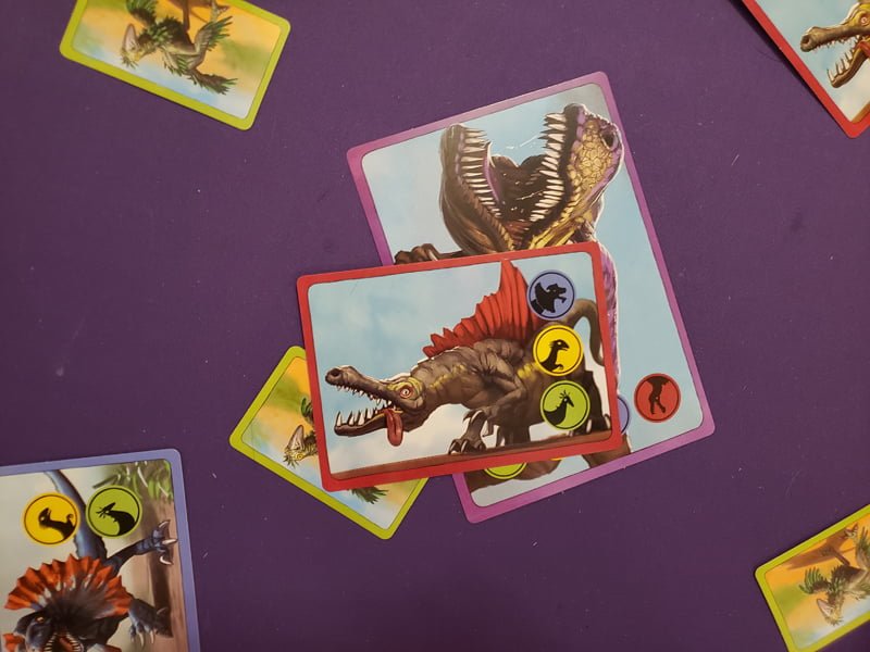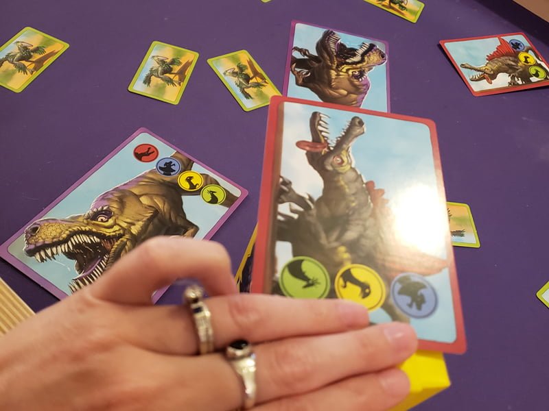 Any dinosaurs the card touches that qualifies as prey (even dinosaurs other players hunted with) and is then taken by the player and placed beneath their Wooden Marker. The Dinosaur Cards all have color-coded edges and the card notes which dinosaurs qualify as prey by color. Your dinosaur remains on the hunting grounds even if it didn’t catch anyone. If he goes off a table, the card can be picked up, but it is now out of play. Dinosaurs under the Wooden Marker may not go hunting (they were eaten after all).
