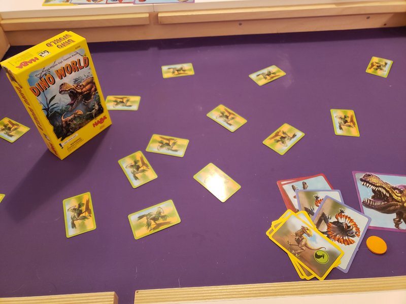 Dino World is made with quality pieces, sets up quickly, cleans up quickly, and plays fast enough that it’s easy to fit in multiple rounds of play. The simple play mechanic makes it easy to learn, and it’s quick to get to playing, which kids really like. Don’t let the simplicity of the play mechanic deceive you; there is some finesse into landing that card just right which may make it a bit challenging for some kids under the age six recommendation. There is also a strategy component that comes into play. Do you spend that single T-Rex Card early when there may be smaller dinosaurs closer together or wait until the hunting ground contains more of the Players’ dinosaurs that still count as prey for the dinosaur at the top of the food chain? Either strategy can pay off, but you also have to have a bit of skill to make it happen too. A (age eight) summed up his approval by saying, “I like the challenge. Can we play again?” He was able to tie for a first place win with another adult, so being an adult does not necessarily give you an edge on the kids.