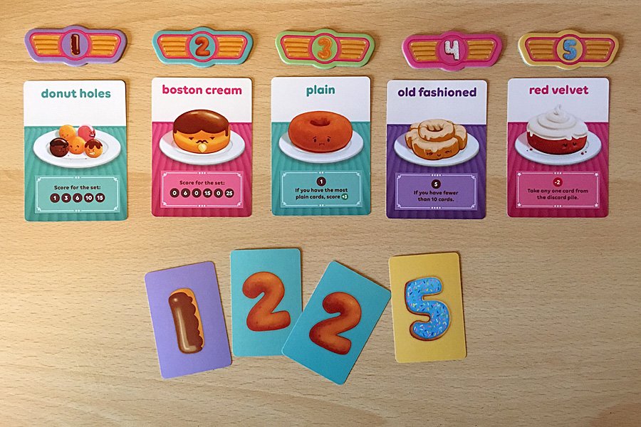 - Maple Bar: Score three points if you have more than six types of donuts in your hand at the end of the game