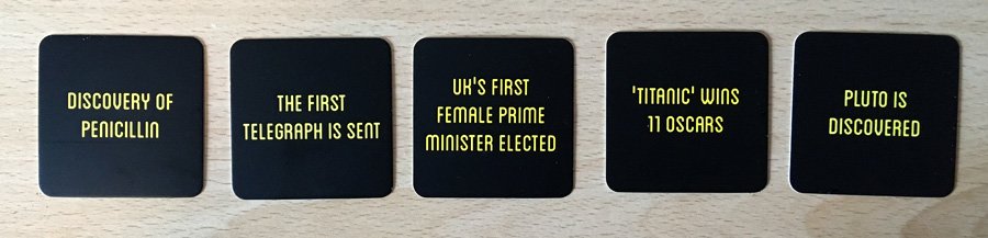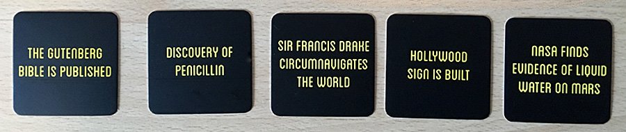 In the example below, the challenging player flips over the cards and reveals that their corrected timeline was wrong. Player Two receives all five cards, even though a look at the dates reveals that Player Two’s original timeline was also incorrect. The challenging player has effectively handed Player Two five extra points.