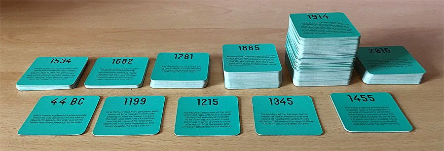 The events cards in Placing the Past date from 44BC through to 2016, however, that 44BC card is a significant outlier and the rest of the deck date from the 1100s onwards, with the majority in later centuries and the 1900s taking up around half the total deck by themselves. Indeed, there are only six cards from the deck of 240 covering the entire of history up until 1500, although that isn’t particularly surprising.