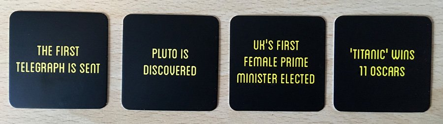 If a player uses the challenge bell, they take Player One’s cards and rearrange them into what they believe to be the correct order. In the example above, a player has challenged Player Two’s timeline and swapped two cards around. Thee challenging player then flip over all the cards. If they are correct, they take all the cards and add them to their own pile. However, if they were wrong, the cards are handed back to Player One who keeps them all, even if their original timeline was also wrong. This means that by challenging and being wrong, you may inadvertently hand points to an opponent who was also wrong, so you need to be confident when choosing to challenge.