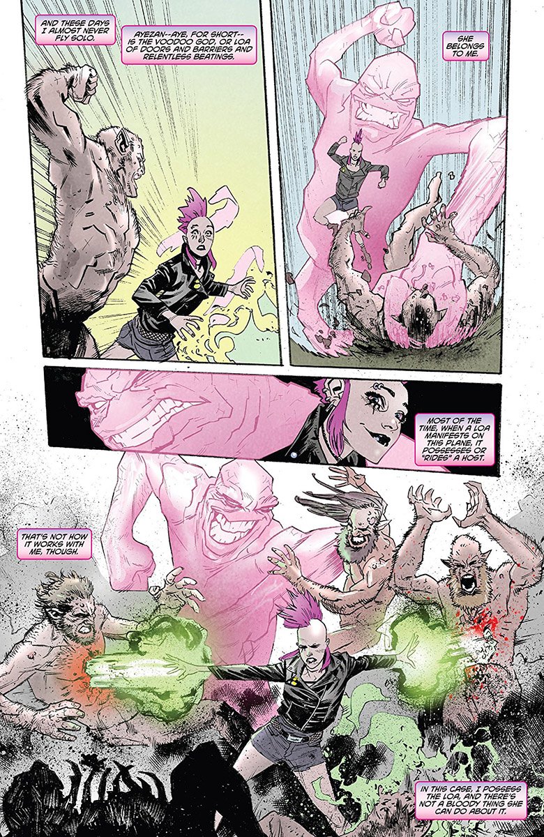 During the battle, Aye is quite literally bagged by a mysterious entity. So Punk Mambo returns the abductees successfully, but now she’s got a bigger problem. Usually, Loa attach themselves to a host, effectively possessing them. In Victoria’s case, she has bound Aye, short for Ayezan, to herself flipping the tables and effectively “possessing” the Loa. Whoever or whatever kidnapped Aye was powerful, and such an affront is not about to go unchallenged.