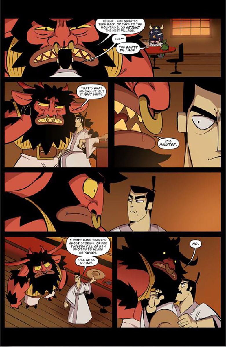Samurai Jack seeks the truth, but not all truth is to be shared. In Samurai Jack Lost Worlds #2, Jack is once more the solo traveler. He stops in a tavern while following the mountain road. Locals notice him and suspect what he has planned. They warn him about the empty village and its terrifying hauntings. Jack continues unafraid and determined to learn the truth of the locals’ warnings. Once he discovers the village, he faces a fierce battle that leaves him with a difficult choice.