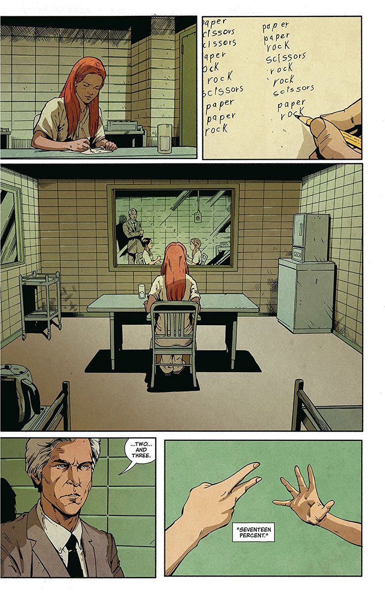 Farrell’s colors communicate so much throughout Stranger Things: Six #1 in their choice and arrangement. The very seventies color scheme of Francine’s flashbacks sets the period perfectly. The muted and subdued pastels of the sterile lab speak depression. This is all the more clear when the vivid reds, blacks, and greens of the Upside Down bleed into her world.