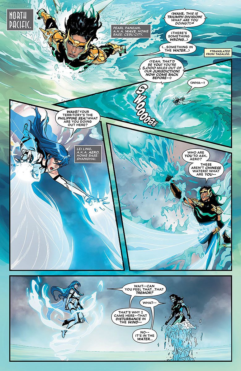 While Woo is meeting with the group of heroes, things are happening in the North Pacific. Pearl Pangan a.k.a Wave soars above the water seeking out a mysterious source of trouble. Well out of her jurisdiction the first Filipina superhero runs into one of Marvel’s first Chinese superheroes Aero. It’s clear the two know each other, but before they can figure out what is happening they are attacked by the Fire Goblins and knocked out.