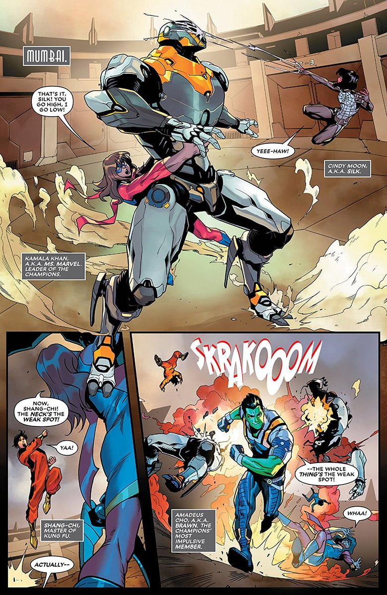 Kamala and Cho have been summoned to Mumbai by Jimmy Woo, the leader of Atlas, to help with a demonstration at The Pan-Asian School for the Unusually Gifted. Silk and Shang-Chi are there as well. As the five of them have lunch, the bitterness between Kamala and Cho becomes apparent.