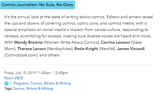 Beyond panels, I’m looking forward to exploring SDCC’s artist alley. Each convention I’ve attended seems to attract and accept different types of people into their artist areas: New York Comic Con, for example, has a high concentration current and former superhero comic artists, while Emerald City Comic Con tends to have a more indie and eclectic vibe; one of the reasons I love ECCC is that there are plenty of people creating queer comics. Since this is my first time at SDCC, I’m quite curious what I’ll see, and hopefully, I’ll find a few new comics to follow.