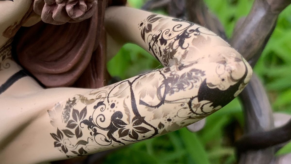 However, my favorite details are the tattoos. As someone with nearly full sleeves, the quality of Poison Ivy’s tattoos respects the art of both tattoos and sculpture. The detailed linework matches the best tattoo art I’ve seen. Moreover, given the statue’s sepia tones, the all-black tattoos pop off the statue.