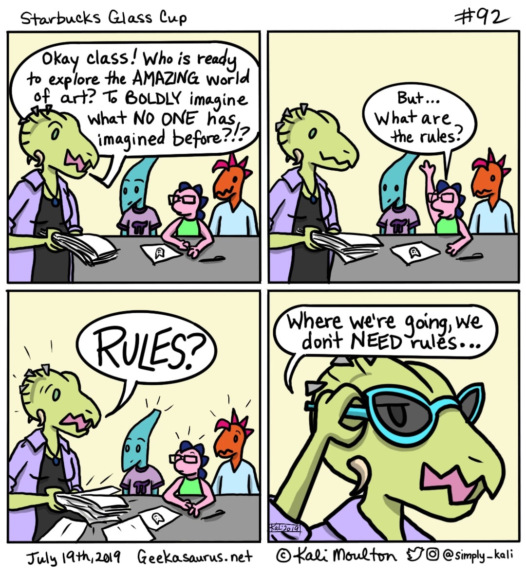 Why is the comic called “Starbucks Glass Cup” instead of something more… fitting? Because I taught an art class this week at the Lane Memorial Library on creating characters. It was a class where we focused on imagination and inspiration rather than a technical how-to class. Annnnd… I let the kids name the comic. It was a collaborative group effort. They voted. This was the result.